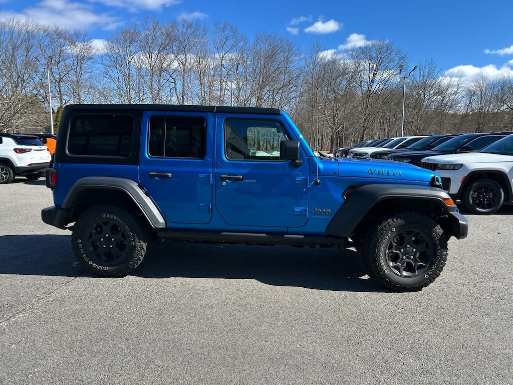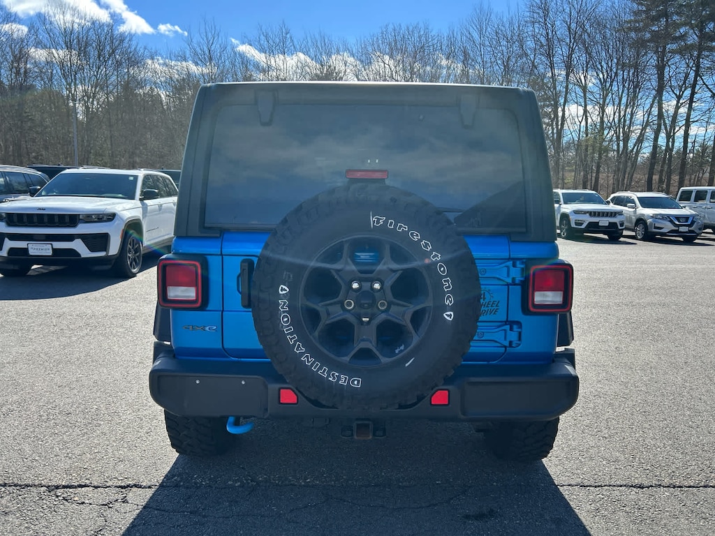 Freedom Panel Storage Bag, Rear Window Defroster, Rear Window Wiper/Washer, Heated Steering Wheel, Remote Start System, Heated Front Seats, Class II Receiver Hitch, 700 Amp Maintenance Free Battery, 7 & 4 Pin Wiring Harness, Auxiliary Switches, Off-Road Info Pages, SiriusXM Traffic Plus, HD Radio, Radio: Uconnect 4C Nav w/8.4 Display, For Details, Visit DriveUconnect.com, Rear View Auto Dim Mirror, 1-Year SiriusXM Guardian Trial, GPS Navigation, SiriusXM Travel Link, Emergency/Assistance Call, 8.4 Touchscreen Display, Universal Garage Door Opener, Engine: 2.0L I4 DOHC DI Turbo PHEV, Transmission: 8-Speed Auto 8P75PH PHEV, Willys, 4xe 4-Wheel Drive Swing Gate Decal, Willys 4xe Hood Decal, Black Grille, MOPAR All-Weather Floor Mats, Rock Protection Sill Rails, 97 MPH Vehicle Max Speed Calibration, Anti-Spin Differential Rear Axle, Molded-In-Color Fender Flares (2-Piece), Front LED Fog Lamps, LED Premium Reflector Headlamps, LED Headlamp & Fog Lamp Group, (STD), (STD). MP3 Player, Keyless Entry, Privacy Glass, Child Safety Locks.